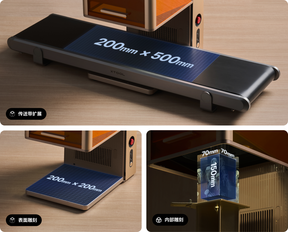F2 Ultra UV 标配双可切换场镜,支持内雕与表面雕刻的双模式操作,并拥有宽阔的工作空间,实现功率、尺寸与雕刻品质的完美平衡。 搭配传送带扩展后,您将获得更高的灵活性和创作自由,轻松应对多样化需求。