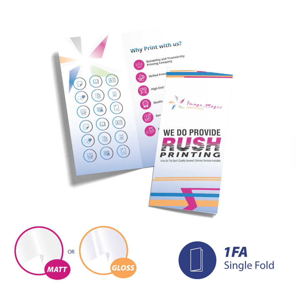 印刷高品质哑膜或光膜的对折或三折宣传册。非常适合公司简介、菜单或高端营销宣传单。
