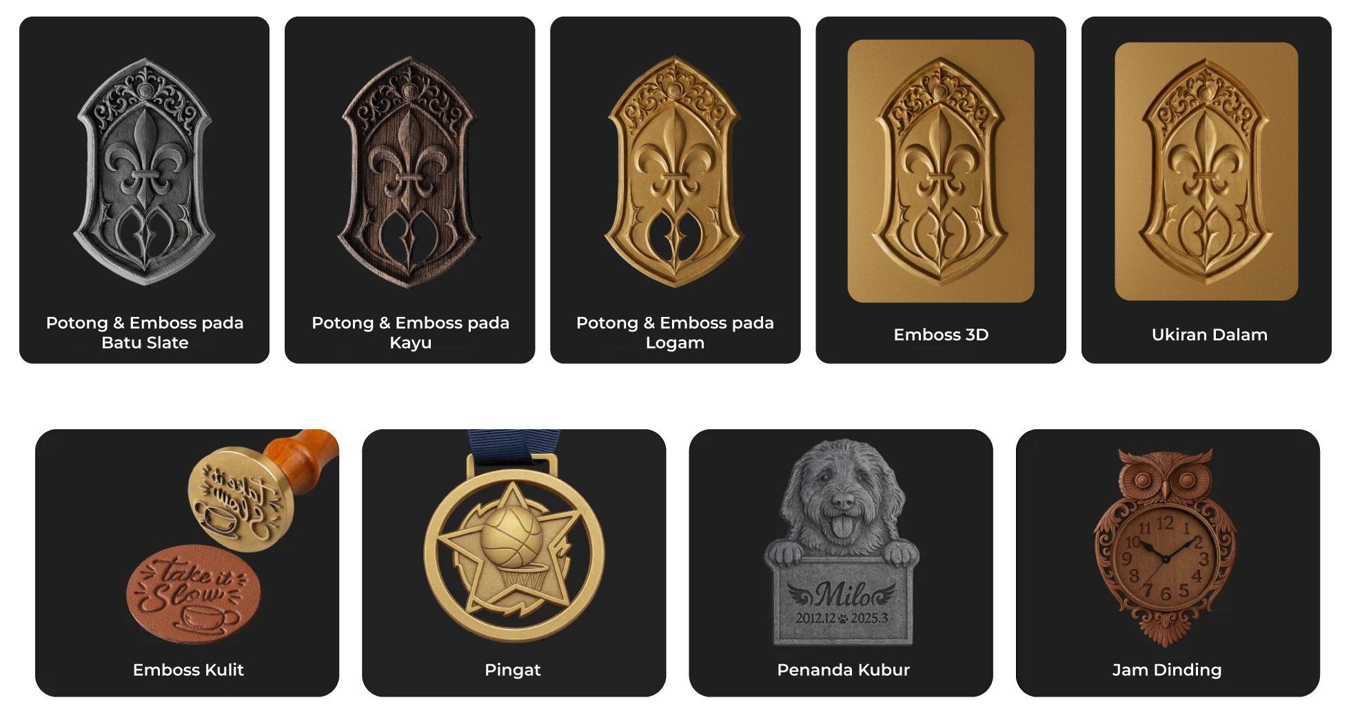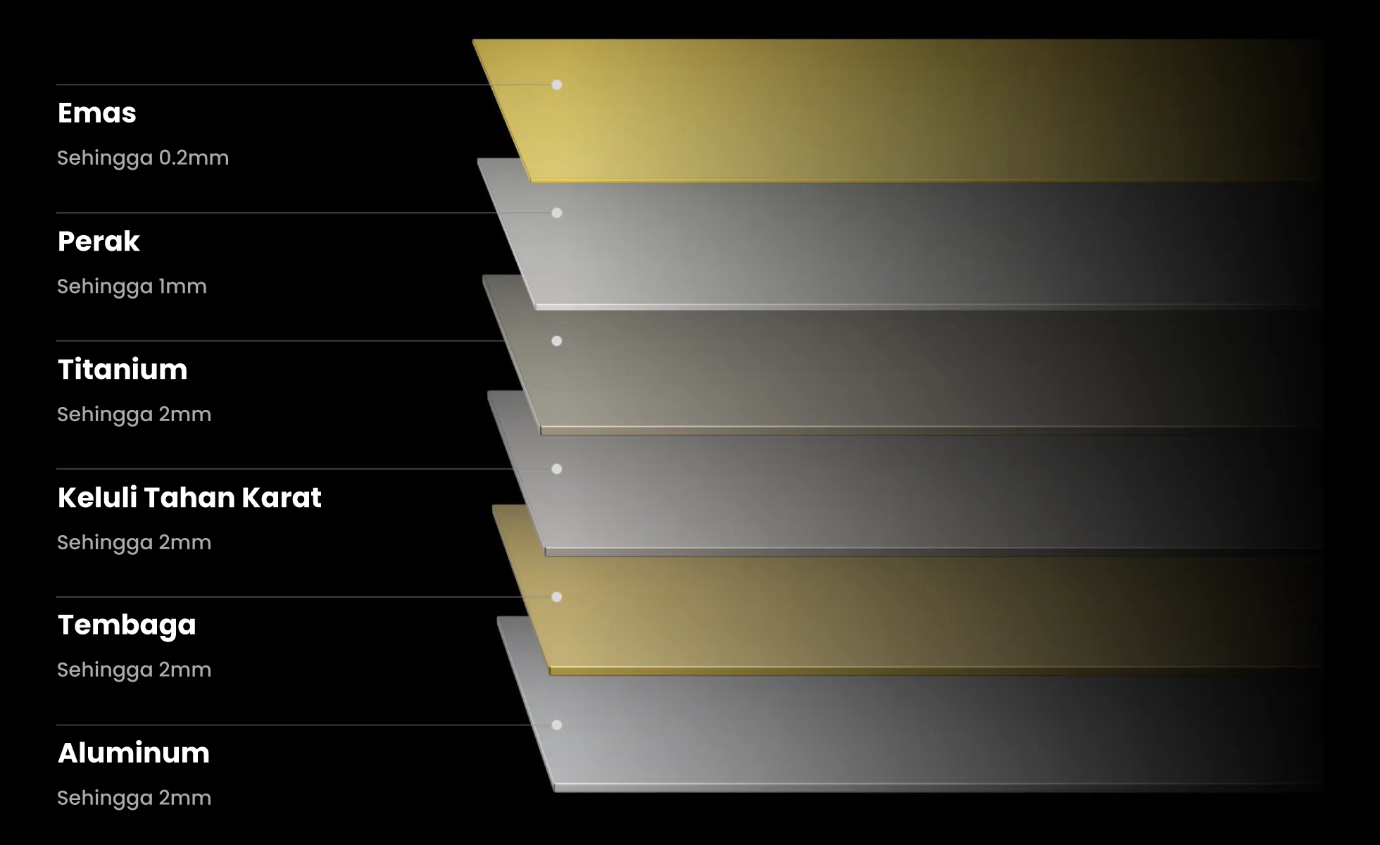 | Bahan yang Disokong | Boleh Dipotong: Laser Diod: Kertas, Kayu, Kulit, MDF, Felt, Sesetengah Akrilik Gelap Legap Laser MOPA: Tembaga (Brass), Keluli Tahan Karat, Aluminium Boleh Diukir: Laser Diod: Kertas, Kayu, Kulit, MDF, Felt, Sesetengah Akrilik Gelap Legap, Buluh, Fabrik, Kaca Gelap, Seramik, Jade, Marmar, Batu Slate, Simen, Bata, Logam Bersalut, Logam Bercat Laser MOPA: Keluli Tahan Karat, Aluminium, Tembaga (Brass), Perak, Plastik, Platinum, Titanium, Emas |